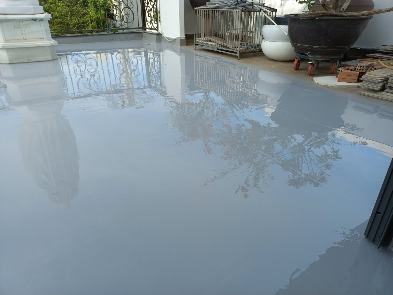 - Chuẩn bị bề mặt: Vệ sinh sạch sẽ bề mặt sàn mái, xử lý các vết nứt, lỗ hổng (nếu có).
